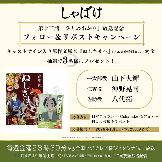 賞品:#山下大輝 #沖野晃司 #八代拓 サイン入りの原作文庫本「ぬしさまへ」(3名様)