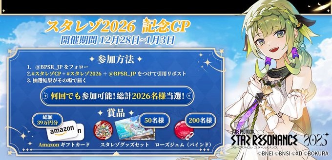 賞品:Amazonギフト券、スタレゾグッズセット、ゲーム内アイテム(総計2,026名様)
