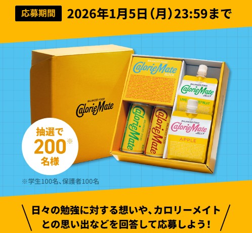 カロリーメイト スペシャルボックスを200名様にプレゼント 2025.12.30カロリーメイト×スタディキャスト コラボキャンペーン 賞品:カロリーメイト スペシャルボックス(200名様) 締切:2026年1月5日(月)日々の勉強に対する想いや、カロリーメイト との思い出などを回答して応募しよう!※詳細はキャンペーンページにてご確認ください。応募はこちらから