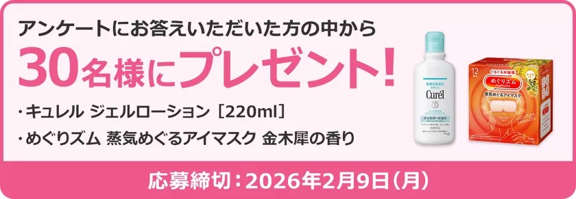 賞品:『キュレル ジェルローション[220ml]』と『めぐりズム 蒸気めぐるアイマスク 金木犀の香り[12枚入]』(30名様)