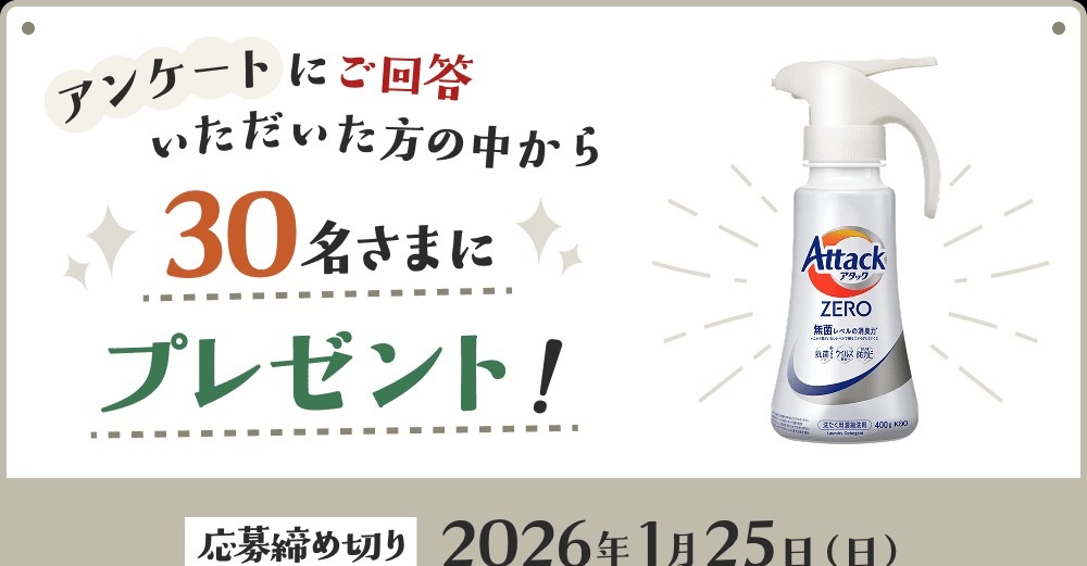 アタックZEROワンハンドタイプを30名様にプレゼント 2025.12.30花王 My Kao‐プレゼントキャンペーン 賞品:アタックZEROワンハンドタイプ(30名様) 締切:2026年1月25日(日)ご応募には会員登録/ログインが必要です。※詳細はキャンペーンページにてご確認ください。応募はこちらから