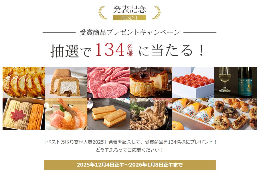 「ベストお取り寄せ大賞2025」受賞商品を合計134名様にプレゼント 2025.12.31おとりよせネット‐みんなで選ぶベストお取り寄せ大賞2025 受賞商品プレゼントキャンペーン 賞品:「ベストお取り寄せ大賞2025」受賞商品(134名様) 締切:2026年1月8日(木)正午応募フォームより必要事項を入力してご応募ください。※詳細はキャンペーンページにてご確認ください。応募はこちらから