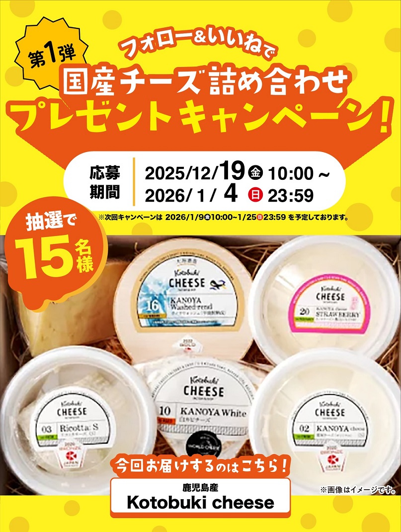 【Instagram懸賞】Kotobuki cheese チーズ詰め合わせセットを15名様にプレゼント 2026.01.01もっと!国産チーズ‐フォロー&いいねキャンペーン 賞品:チーズ詰め合わせセット(15名様) 締切:2026年1月4日(日)応募方法: 1. 公式Instagramアカウントをフォロー 2. 対象の投稿に「いいね!」※詳細はキャンペーンページにてご確認ください。応募はこちらから
