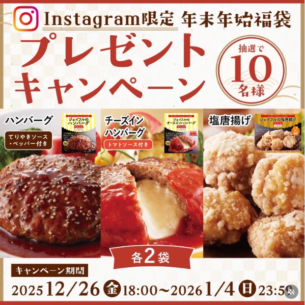 賞品:「ジョイフルのハンバーグ (てりやきソース・ペッパー付き)」2袋、 「ジョイフルのチーズインハンバーグ (トマトソース付き)」2袋、 「ジョイフルの塩唐揚げ」2袋(10名様)