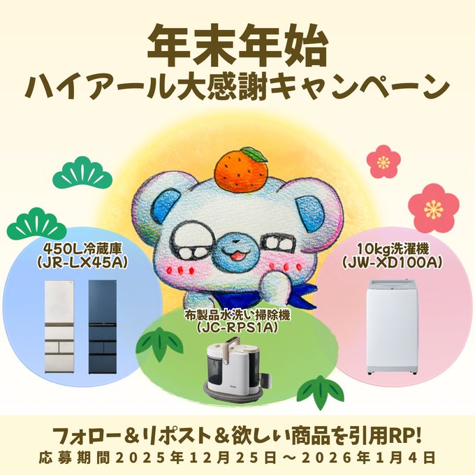【X懸賞】ハイアール 冷蔵庫、洗濯機、水洗い掃除機を合計3名様にプレゼント