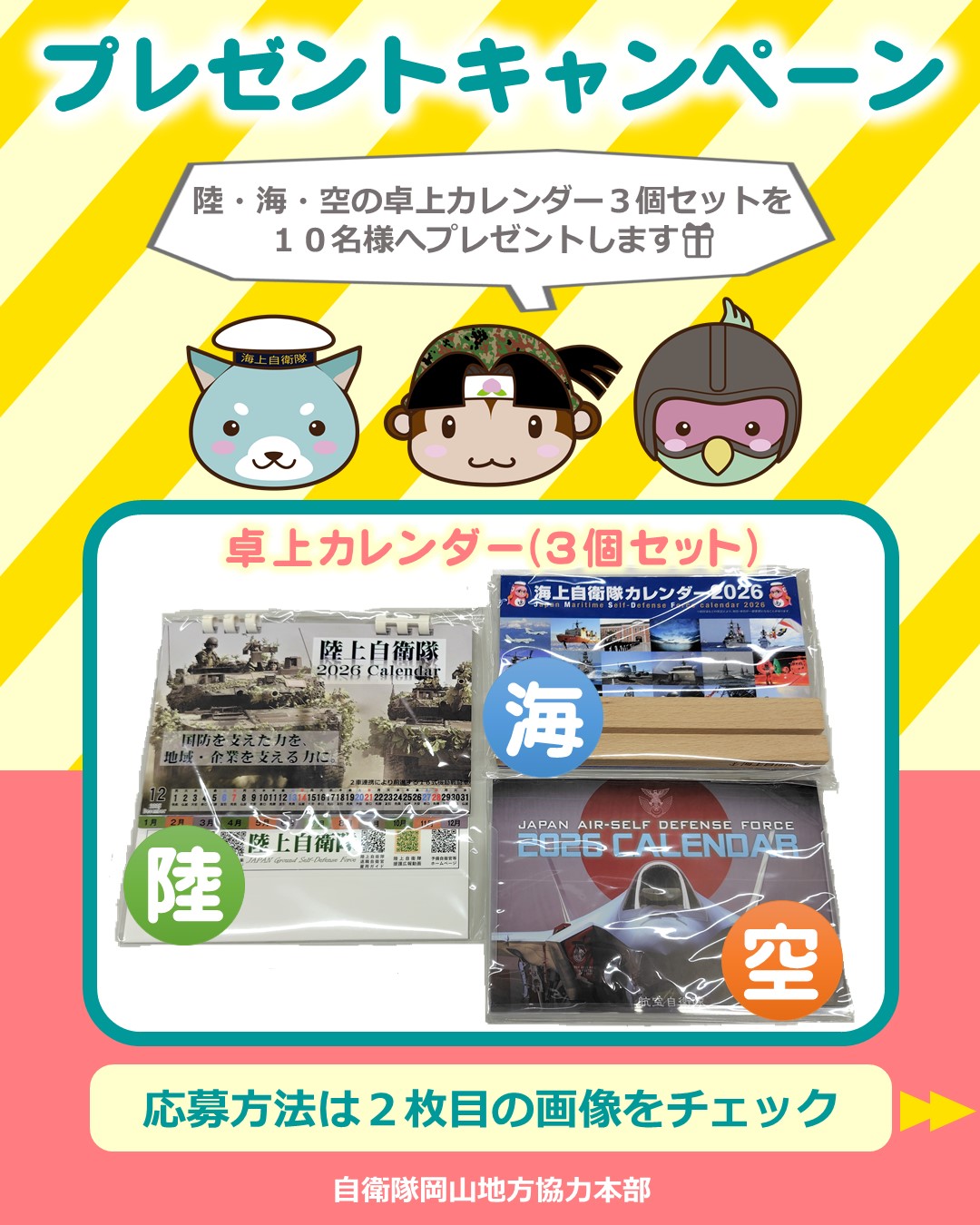 【X・Instagram懸賞】陸・海・空自衛隊の卓上カレンダーセットを10名様にプレゼント 2026.01.02 2026.01.01自衛隊岡山地方協力本部‐プレゼントキャンペーン 賞品:陸・海・空自衛隊の卓上カレンダーセット(10名様) 締切:2026年1月4日(日)Xとインスタあわせて10名の方に 抽選で当たります※詳細はキャンペーンページにてご確認ください。応募はこちらから