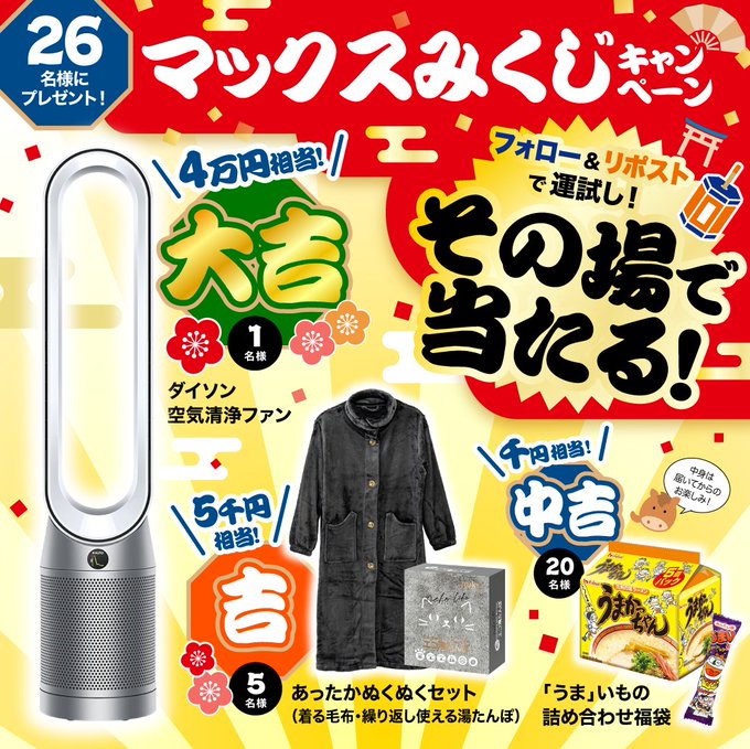 賞品:ダイソン 空気清浄ファン、あったかぬくぬくセット、うまいもの詰め合わせ福袋(合計26名様)