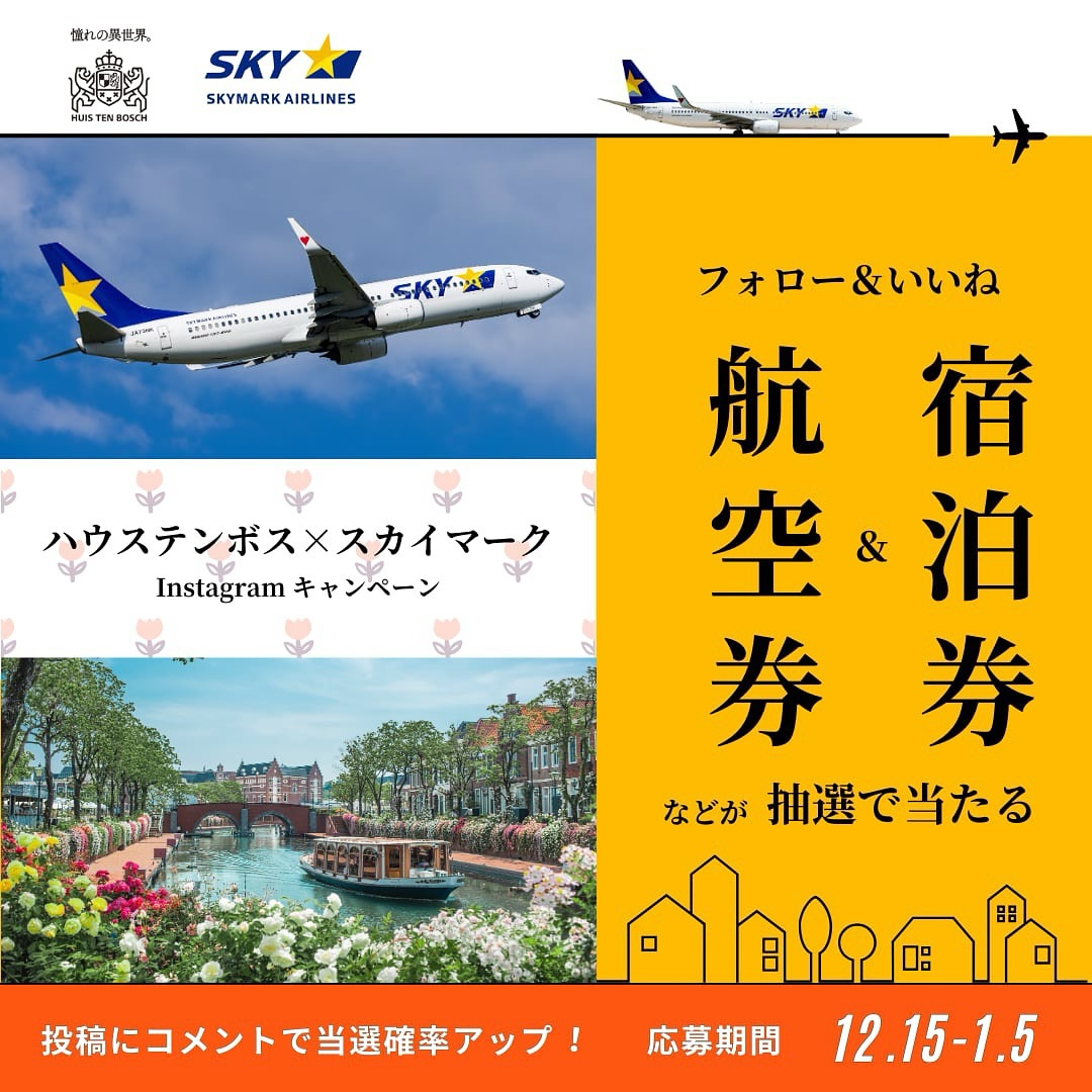賞品:ハウステンボス 1DAYパスポート付きペア宿泊券(ホテルヨーロッパ/1泊2日)+スカイマーク ペア往復航空券(2組4名様)