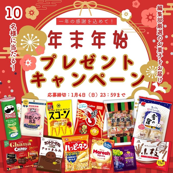 賞品:編集部厳選「盛りだくさん お菓子12種類セット」(10名様)