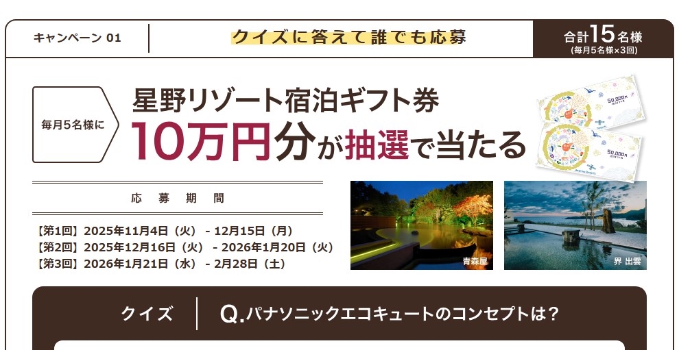 星野リゾート宿泊ギフト券10万円分を毎月5名様にプレゼント 2026.01.02Panasonic‐エコキュートで家族にいいこと、あたるよキャンペーン 賞品:星野リゾート宿泊ギフト券10万円分(毎月5名様) 締切:2026年2月28日(土)クイズに答えてご応募ください。※詳細はキャンペーンページにてご確認ください。応募はこちらから