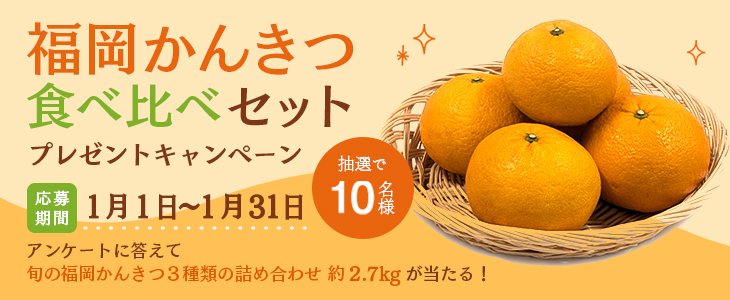 旬の福岡かんきつ3種類の詰め合わせを10名様にプレゼント 2026.01.02JA全農ふくれん‐プレゼントキャンペーン 賞品:旬の福岡かんきつ3種類の詰め合わせ(10名様) 締切:2026年1月31日(土)アンケートに答えてご応募ください。※詳細はキャンペーンページにてご確認ください。応募はこちらから