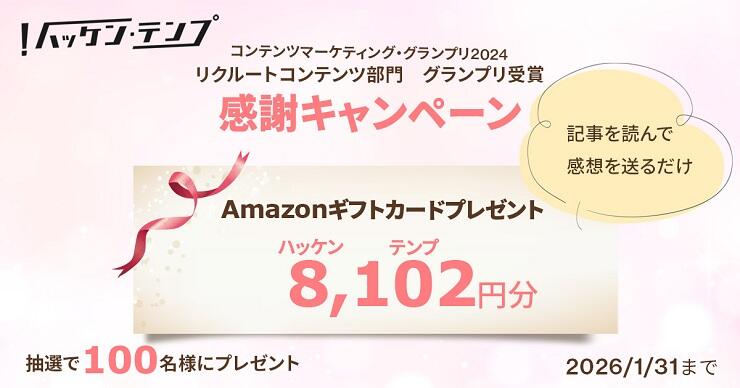 『ハッケン・テンプ』の記事を読んで感想を送っていただいた方の中から抽選で100名様に、“8,102(ハッケン・テンプ)円”のAmazonギフトカードをプレゼント