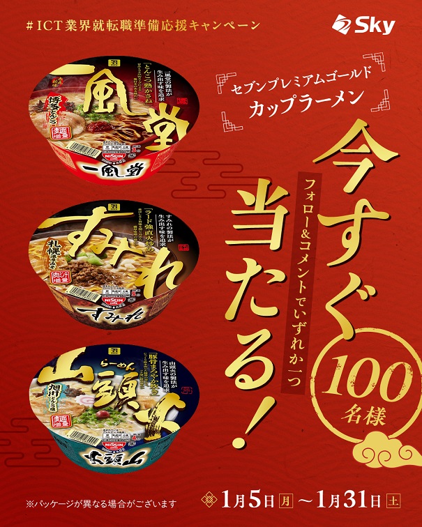賞品:セブンプレミアムゴールド カップラーメン 一風堂 赤丸新味 博多とんこつ・すみれ 札幌濃厚味噌・山頭火 旭川とんこつ塩 3種類から1つ(100名様)