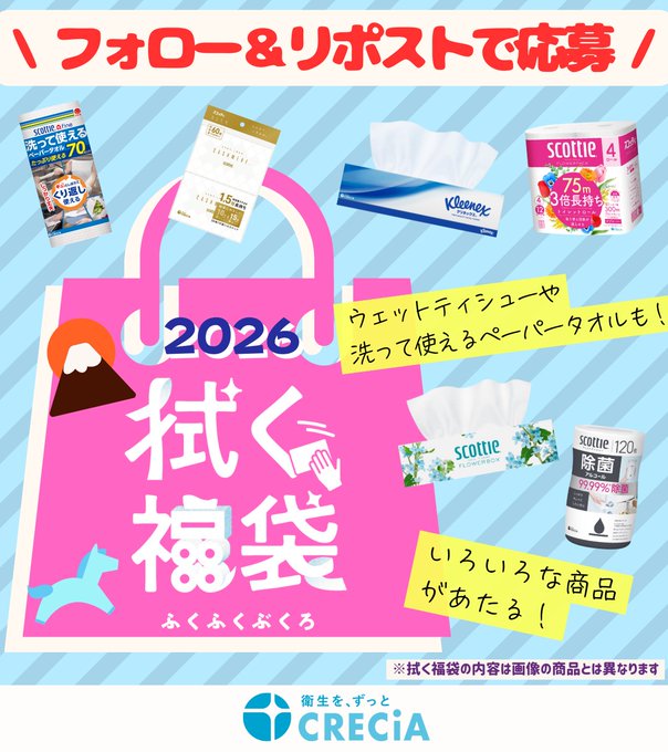 【X懸賞】クレシアの拭く福袋を10名様にプレゼント 2026.01.05クレシア‐フォロー&リポストキャンペーン 賞品:クレシアの #拭く福袋(10名様) 締切:2026年1月7日(水)公式X(Twitter)アカウントをフォロー&キャンペーン対象ポストをリポストしてご応募ください。※詳細はキャンペーンページにてご確認ください。応募はこちらから