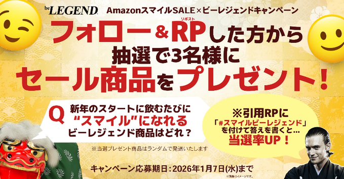 【X懸賞】ビーレジェンド商品を3名様にプレゼント 2026.01.05AmazonスマイルSALE × ビーレジェンド 新春キャンペーン 賞品:ビーレジェンド商品(3名様) 締切:2026年1月7日(水)参加方法 ①フォロー&RP ②RPに「#スマイルビーレジェンド」を付けて投稿※詳細はキャンペーンページにてご確認ください。応募はこちらから