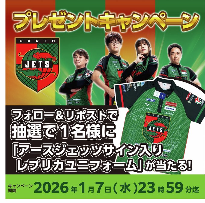 賞品:アースジェッツレプリカユニフォーム(選手4人サイン入り)(1名様)