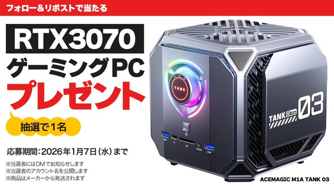 賞品:RTX 3070 / Core i9-12900H / 32GBメモリー搭載『ACEMAGIC M1A TANK 03』未使用新品(1名様)