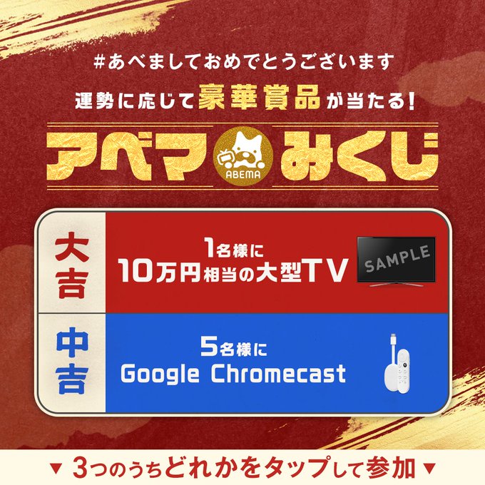 【X懸賞】10万円相当の大型テレビ、Google Chromecastを合計6名様にプレゼント 2026.01.05ABEMA‐アベマみくじ 賞品: 大型テレビ(1名様) Google Chromecast(5名様) 締切:2026年1月7日(水)@ABEMAフォロー&おみくじを選んで参加→結果を投稿してね!※詳細はキャンペーンページにてご確認ください。応募はこちらから