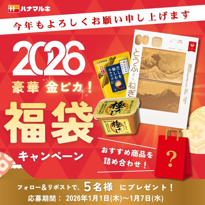 【X懸賞】金ピカ商品を集めた福袋を5名様にプレゼント 2026.01.05ハナマルキ‐豪華 #金ピカ 福袋キャンペーン 賞品:金ピカ商品を集めた福袋(5名様) 締切:2026年1月7日(水)公式X(Twitter)アカウントをフォロー&キャンペーン対象ポストをリポストしてご応募ください。※詳細はキャンペーンページにてご確認ください。応募はこちらから