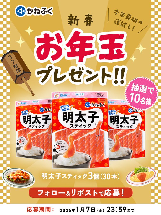 【X懸賞】明太子スティック3個セットを10名様にプレゼント 2026.01.05かねふく‐お年玉キャンペーン 賞品:明太子スティック 3個セット(10名様) 締切:2026年1月7日(水)公式X(Twitter)アカウントをフォロー&キャンペーン対象ポストをリポストしてご応募ください。※詳細はキャンペーンページにてご確認ください。応募はこちらから