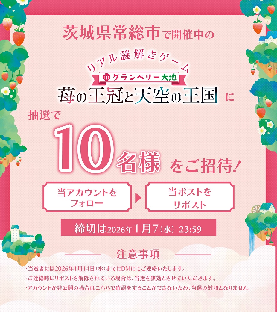 賞品:茨城県常総市にて開催中の『リアル謎解きゲームinグランベリー大地 ~苺の王冠と天空の王国~』にご招待(10名様)