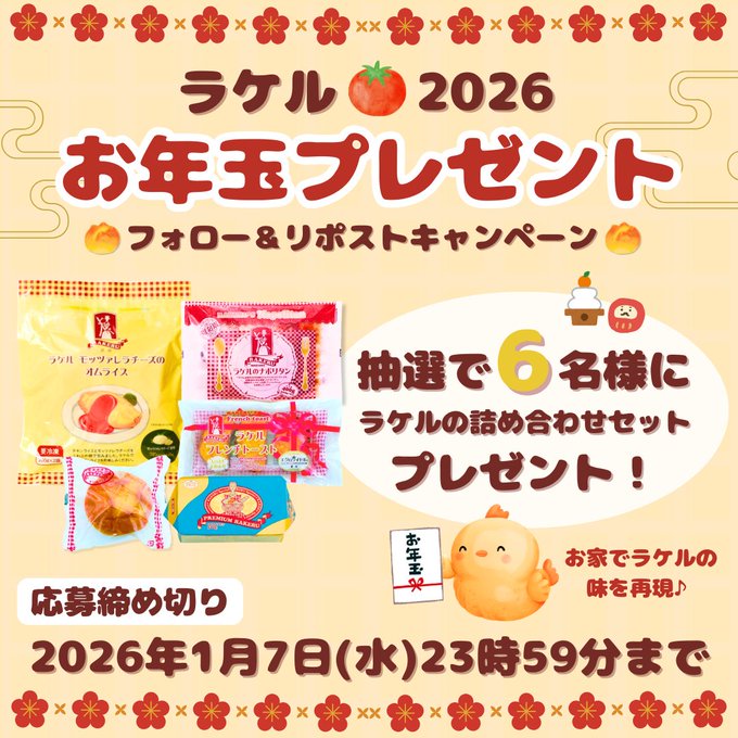 【X懸賞】ラケル詰め合わせセットを6名様にプレゼント 2026.01.05RAKERU(ラケル)‐お年玉キャンペーン 賞品:ラケル詰め合わせセット(6名様) 締切:2026年1月7日(水)公式X(Twitter)アカウントをフォロー&キャンペーン対象ポストをリポストしてご応募ください。※詳細はキャンペーンページにてご確認ください。応募はこちらから