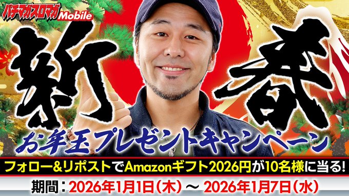 【X懸賞】Amazonギフト券2,026円分を10名様にプレゼント 2026.01.05パチマガスロマガMobile‐新春お年玉キャンペーン 賞品:Amazonギフト券2,026円分(10名様) 締切:2026年1月7日(水)参加方法 ①アカウントをフォロー ②投稿をリポストor引用リポスト🔁※詳細はキャンペーンページにてご確認ください。応募はこちらから