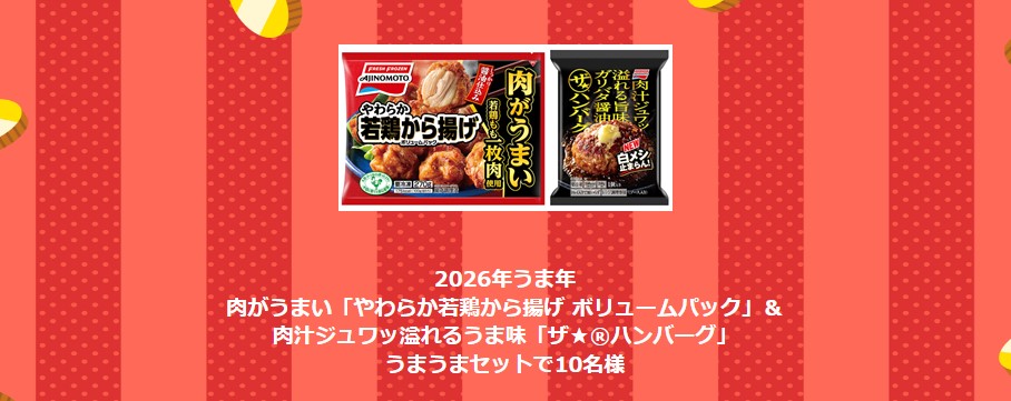 賞品:「やわらか若鶏から揚げ ボリュームパック」&肉汁ジュワッ溢れるうま味「ザ★®ハンバーグ」(10名様)
