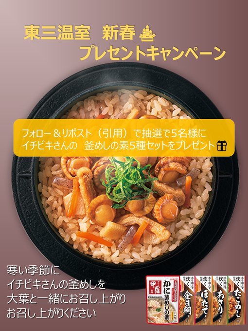 【X懸賞】釜めしの素セットを5名様にプレゼント 2026.01.06東三温室園芸農業協同組合‐新春キャンペーン 賞品:釜めしの素セット(5名様) 締切:2026年1月8日(木)フォロー&引用ポスト(リポスト)で抽選で5名様に釜めしの素セットをプレゼント!※詳細はキャンペーンページにてご確認ください。応募はこちらから