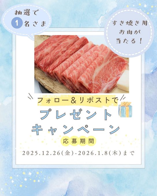 【X懸賞】すき焼き用のお肉を1名様にプレゼント 2026.01.06伊勢丹グルメ1年間ありがとう!プレゼントキャンペーン 賞品:すき焼き用のお肉(1名様) 締切:2026年1月8日(木)公式X(Twitter)アカウントをフォロー&キャンペーン対象ポストをリポストしてご応募ください。※詳細はキャンペーンページにてご確認ください。応募はこちらから