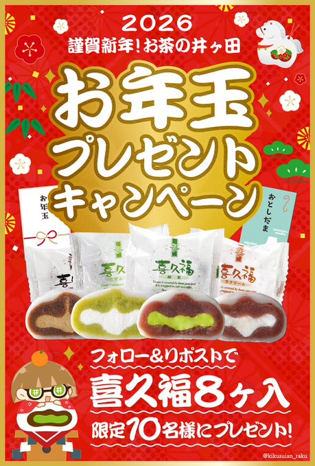 【X懸賞】喜久福8個入を10名様にプレゼント 2026.01.06お茶の井ヶ田 喜久水庵‐フォロー&リポストキャンペーン 賞品:喜久福8個入(10名様) 締切:2026年1月8日(木)公式X(Twitter)アカウントをフォロー&キャンペーン対象ポストをリポストしてご応募ください。※詳細はキャンペーンページにてご確認ください。応募はこちらから