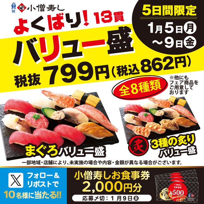 【X懸賞】小僧寿しお食事券2,000円分を10名様にプレゼント 2026.01.06小僧寿し‐フォロー&リポストキャンペーン 賞品:お食事券2,000円分(10名様) 締切:2026年1月8日(木)公式X(Twitter)アカウントをフォロー&キャンペーン対象ポストをリポストしてご応募ください。※詳細はキャンペーンページにてご確認ください。応募はこちらから