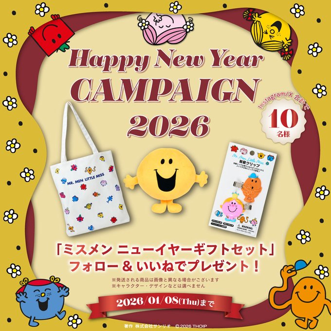 【X・Instagram懸賞】ミスメンニューイヤーギフトセットを10名様にプレゼント 2026.01.06ミスターメン リトルミス‐プレゼントキャンペーン 賞品:ミスメンニューイヤーギフトセット(10名様) 締切:2026年1月8日(木)抽選でInstagram/X合計で10名様に「ミスメンニューイヤーギフトセット」をプレゼント!🎁※詳細はキャンペーンページにてご確認ください。応募はこちらから