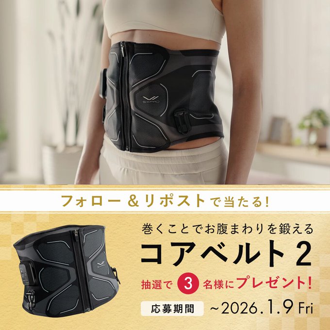 【X懸賞】シックスパッド コアベルト2を3名様にプレゼント 2026.01.07SIXPAD‐新年はトレーニングをはじめようキャンペーン 賞品:コアベルト2(3名様) 締切:2026年1月9日(金)公式X(Twitter)アカウントをフォロー&キャンペーン対象ポストをリポストしてご応募ください。※詳細はキャンペーンページにてご確認ください。応募はこちらから