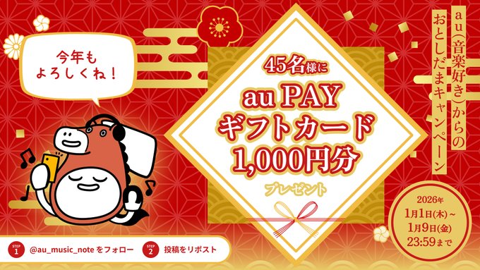 賞品:au PAY ギフトカード1,000円分(45名様)