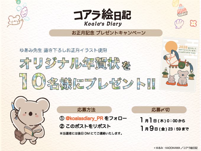 【X懸賞】オリジナル年賀状を10名様にプレゼント 2026.01.07アニメ『コアラ絵日記』‐お年玉キャンペーン 賞品:オリジナル年賀状(10名様) 締切:2026年1月9日(金)公式X(Twitter)アカウントをフォロー&キャンペーン対象ポストをリポストしてご応募ください。※詳細はキャンペーンページにてご確認ください。応募はこちらから