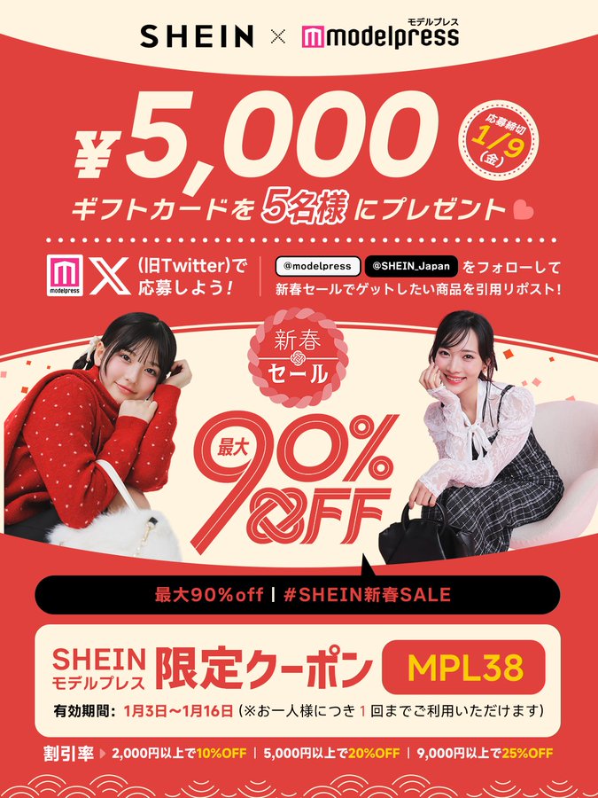 賞品:SHEINギフトカード5,000円分(5名様)