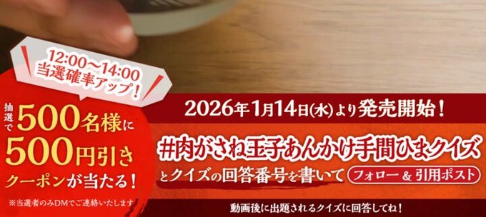 賞品:「肉がさね玉子あんかけうどん」「だし玉肉づつみうどん」「鴨ねぎうどん」にご利用いただける500円引きクーポン(500名様)