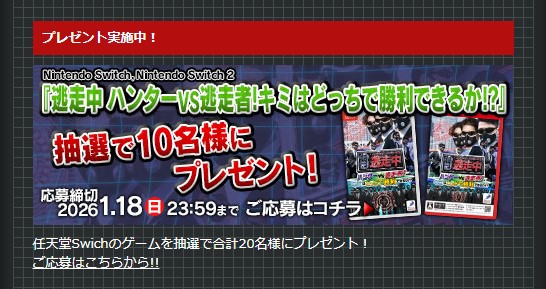 賞品:新作ゲーム『逃走中 ハンターVS逃走者!キミはどっちで勝利できるか!?』(10名様)
