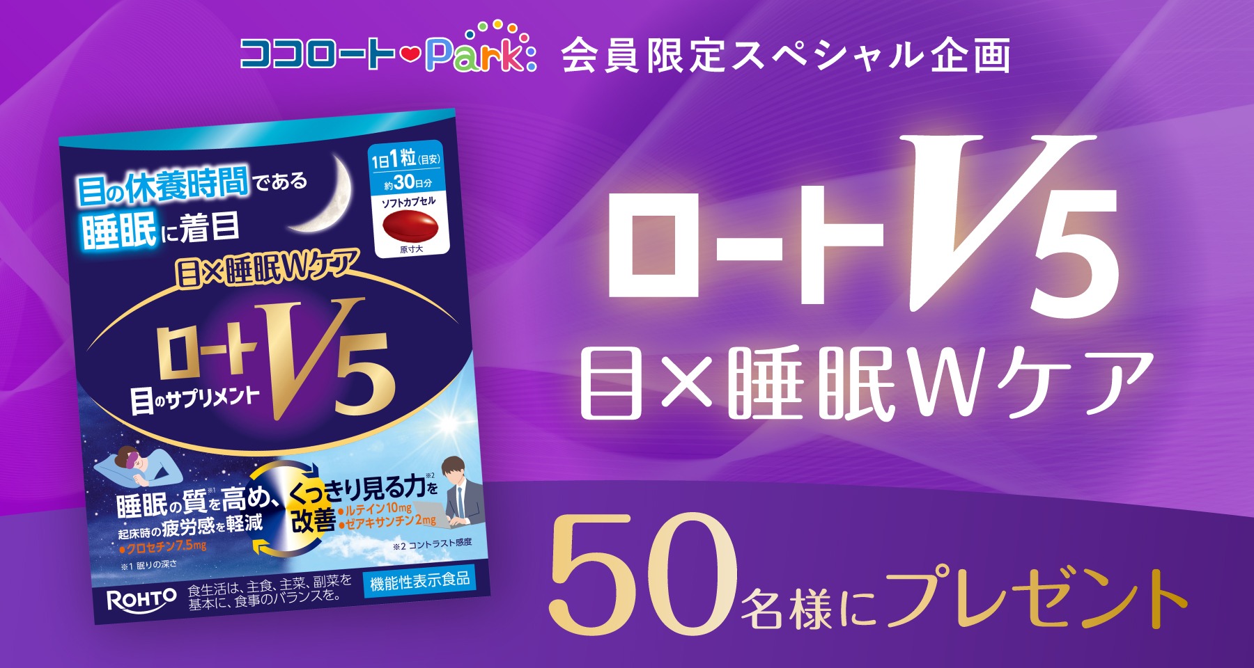 ロートV5 ⽬×睡眠Wケアを50名様にプレゼント 2026.01.07ココロートパーク‐プレゼントキャンペーン 賞品:ロートV5 ⽬×睡眠Wケア(50名様) 締切:2026年2⽉2⽇(⽉)9:59ご応募には会員登録/ログインが必要です。※詳細はキャンペーンページにてご確認ください。応募はこちらから
