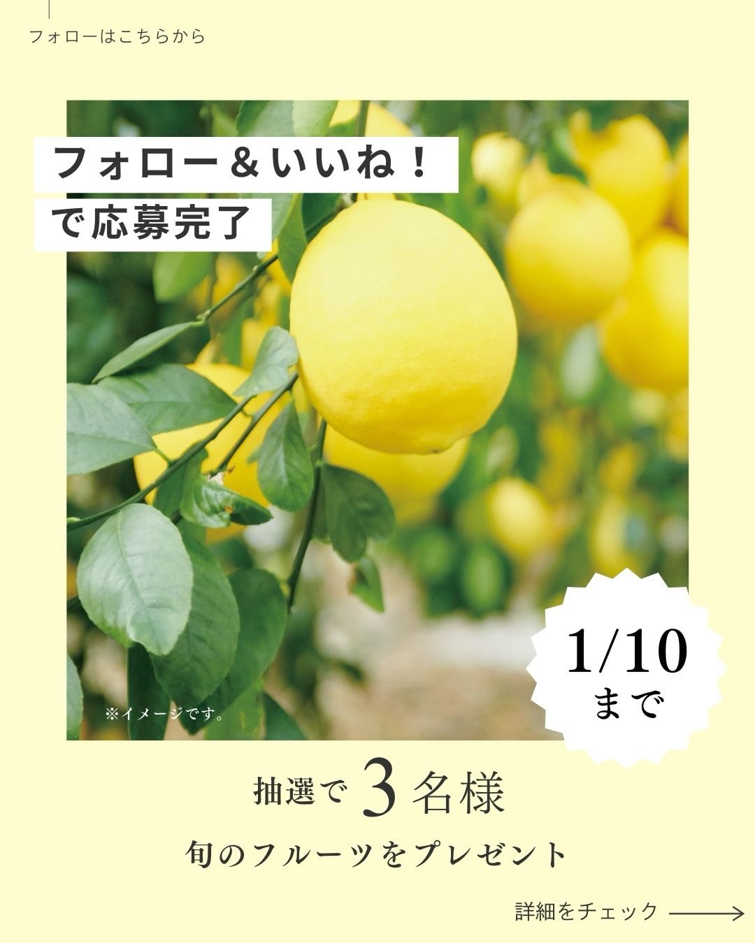 【Instagram懸賞】八丈フルーツレモン1.5kgを3名様にプレゼント 2026.01.08全農広報部‐フォロー&いいねキャンペーン 賞品:八丈フルーツレモン(3名様) 締切:2026年1月10日(土)応募方法: 1. 公式Instagramアカウントをフォロー 2. 対象の投稿に「いいね!」※詳細はキャンペーンページにてご確認ください。応募はこちらから