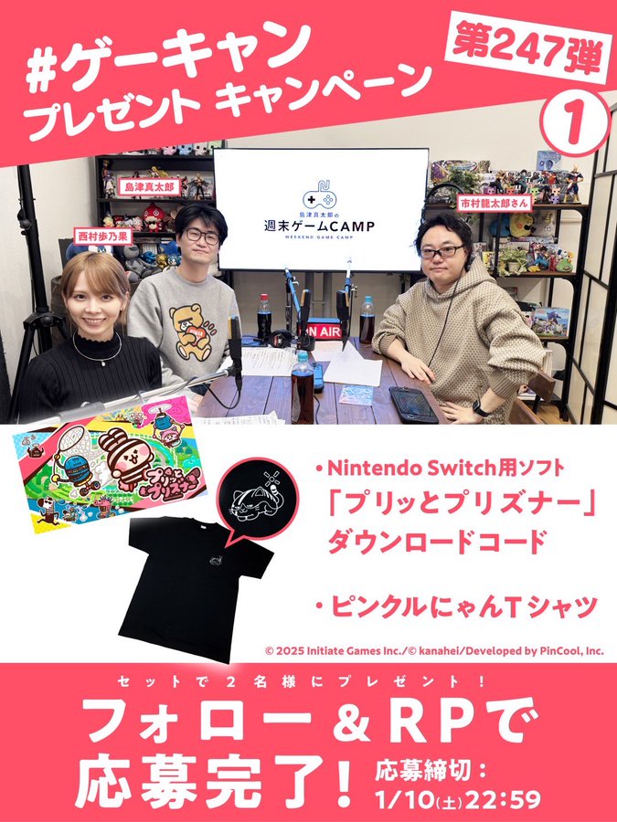 賞品:Nintendo Switch用ソフト『プリッとプリズナー』ダウンロードコードとピンクルにゃんTシャツ(2名様)