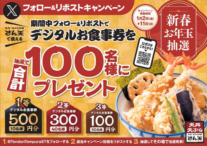 賞品:天丼・天ぷら本舗 さん天でご利用いただけるデジタルお食事券最大500円分(100名様)