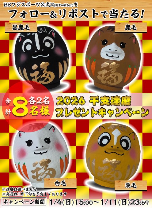 賞品:黒鹿毛・鹿毛・白毛・栗毛の干支達磨(8名様)