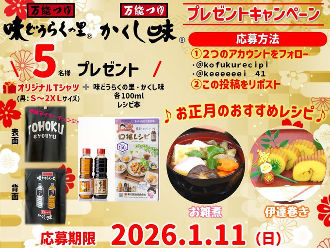 賞品:オリジナルTシャツ(黒:S〜2XL)&味どうらくの里・かくし味100ml +レシピ本(5名様)