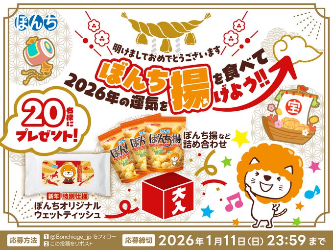 賞品:ぼんち揚詰め合わせとぼんちオリジナルウェットティッシュ20個(20名様)