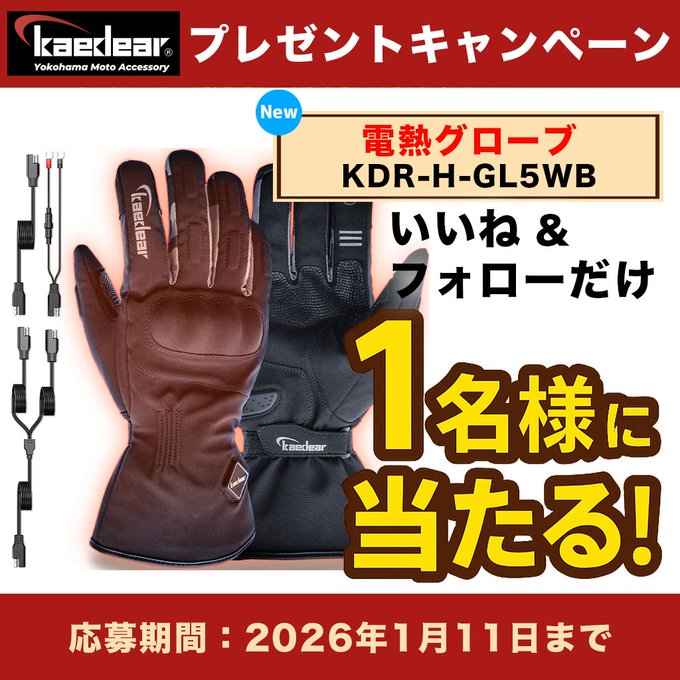 【X懸賞】バイク用電熱グローブを1名様にプレゼント 2026.01.08Kaedear(カエディア)‐冬のバイクライフ応援キャンペーン 賞品:バイク用電熱グローブ(1名様) 締切:2026年1月11日(日)応募方法 ①投稿を「いいね」 ②アカウントをフォロー※詳細はキャンペーンページにてご確認ください。応募はこちらから