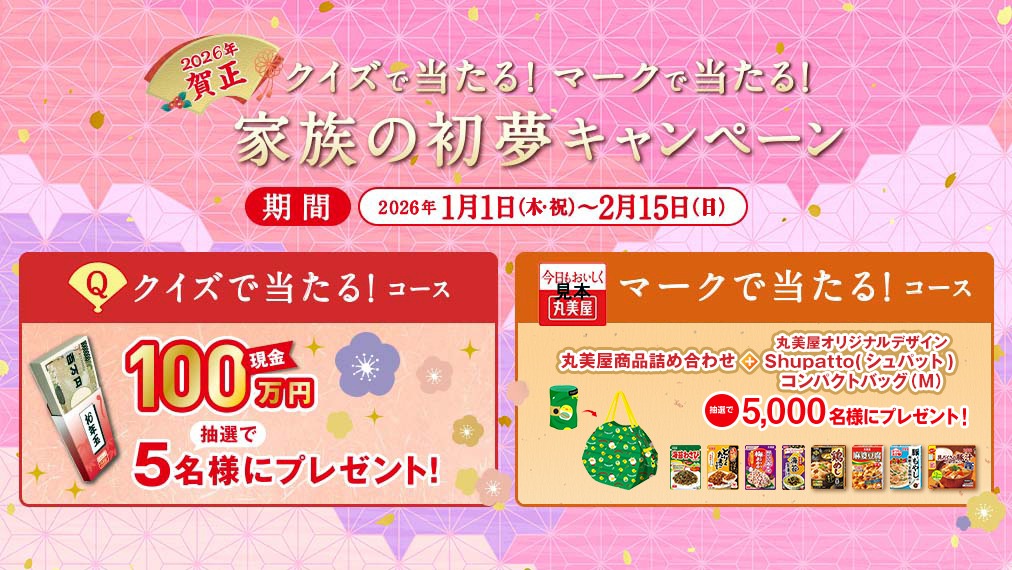 現金100万円を5名様にプレゼント 2026.01.09 2026.01.08丸美屋‐家族の初夢キャンペーン クイズで当たるコース 賞品:現金100万円(5名様) 締切:2026年2月15日(日)クイズに答えてご応募ください。※詳細はキャンペーンページにてご確認ください。応募はこちらから