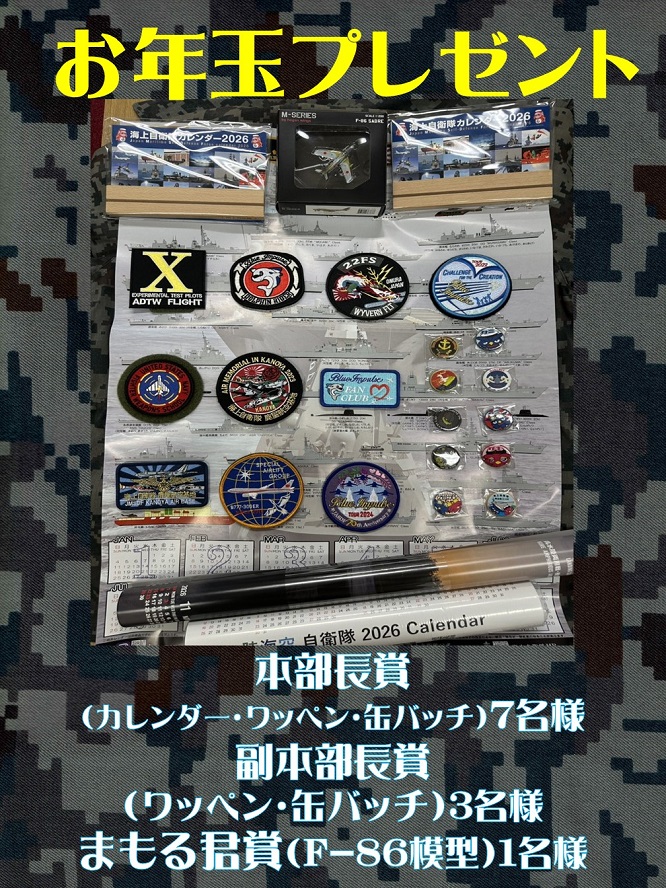 【X懸賞】カレンダー、ワッペン、缶バッジ、模型を合計11名様にプレゼント 2026.01.09自衛隊鹿児島地方協力本部@公式ごわす‐お年玉キャンペーン 賞品:カレンダー、ワッペン、缶バッジ、模型(合計11名様) 締切:2026年1月12日(月)応募方法 ①ポストを いいね&リポスト ②鹿児島地本をフォロー※詳細はキャンペーンページにてご確認ください。応募はこちらから