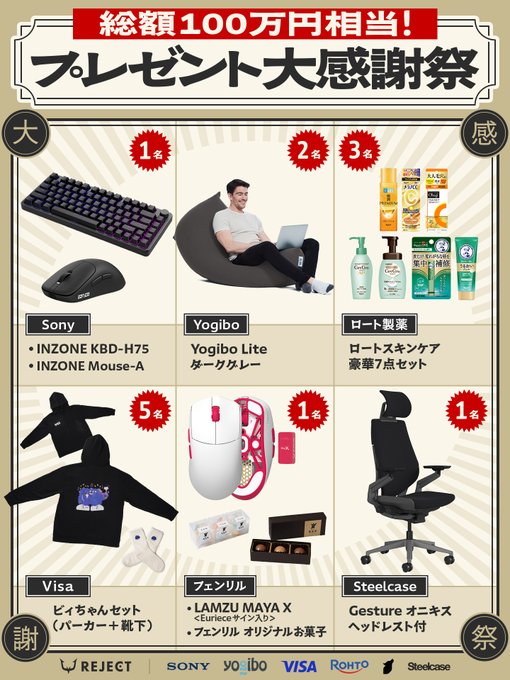 賞品:ゲーミングキーボード、オフィスチェア、ビーズソファ、…ほか(合計13名様)